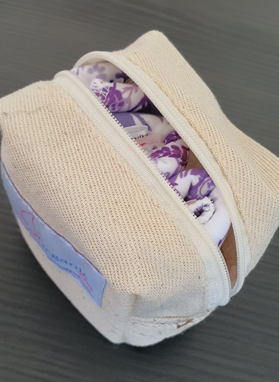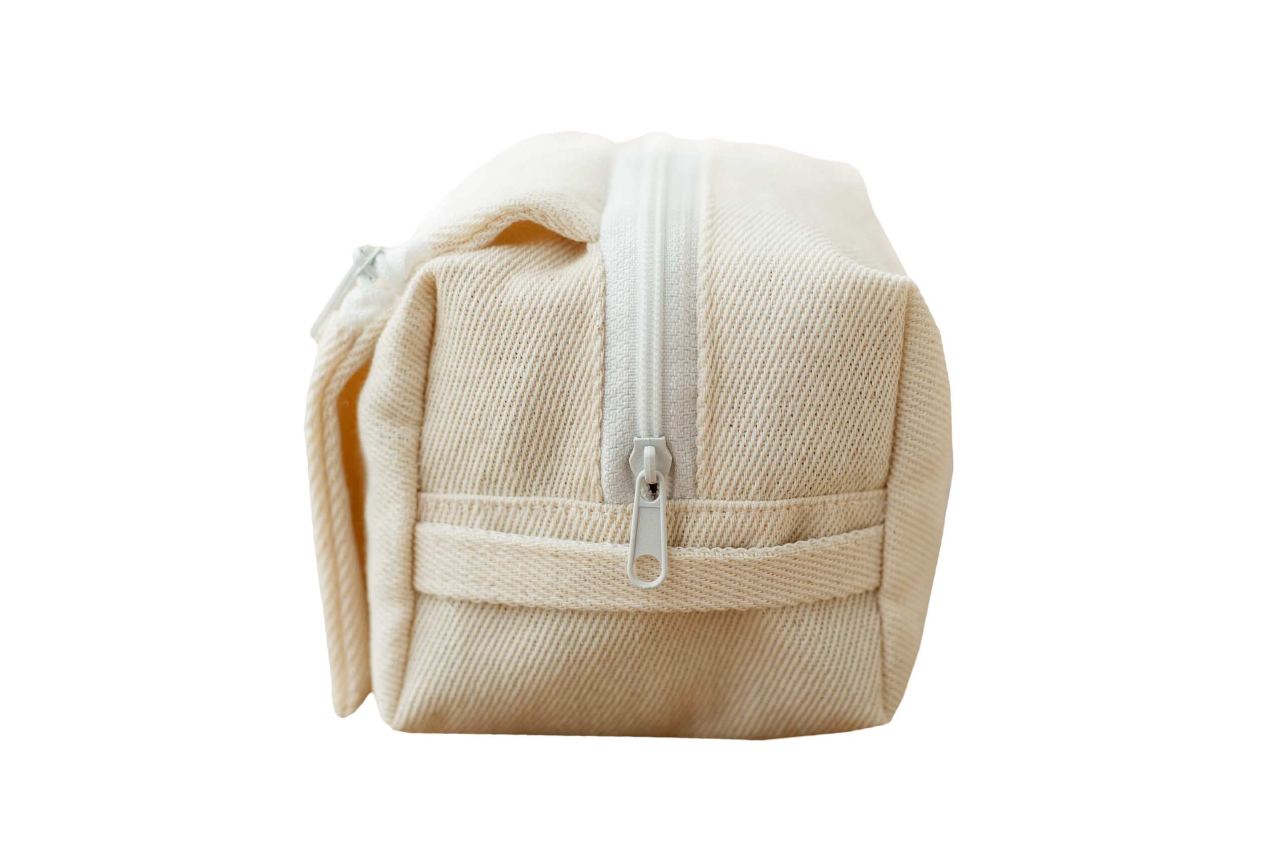 Bawełniany, nieprzemakalny organizer na artykuły sanitarno-higieniczne składa się z dwóch części – dużej komory głównej oraz bocznej, oddzielnej kieszeni. Każda z części posiada oddzielny zamek pozwalający na dowolne dysponowanie zawartością oraz ochronę zawartości przed wilgocią.