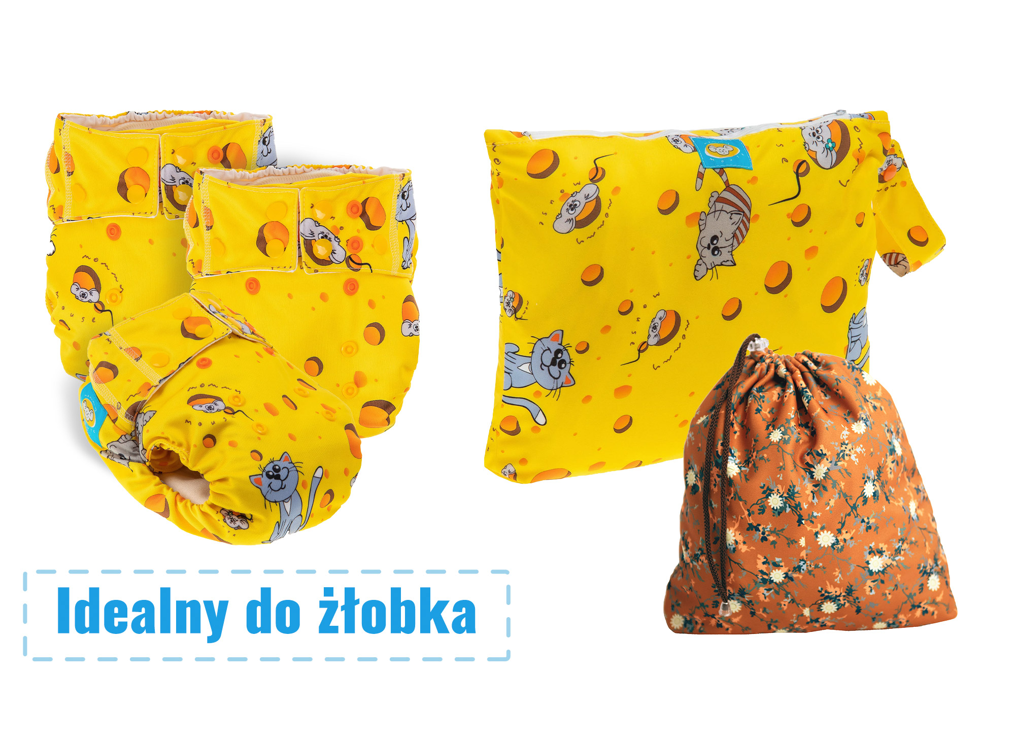 Drugi element zestawu to pojemny, estetyczny i zamykany zamkiem błyskawicznym worek na pieluszki, który pozwala na szybki transport kompletu żłobkowego. Produkt wykonany jest z wodoodpornego materiału oraz posiada pasek z zapinaniem, dzięki czemu można go przypiąć do wózka, roweru czy innego uchwytu. Nadaje się także na plażę, basen lub spacery. Dostępny w 28 wzorach. Worek na pieluchy można prać w pralce w temp. 40°C. Nie należy suszyć w suszarkach bębnowych.