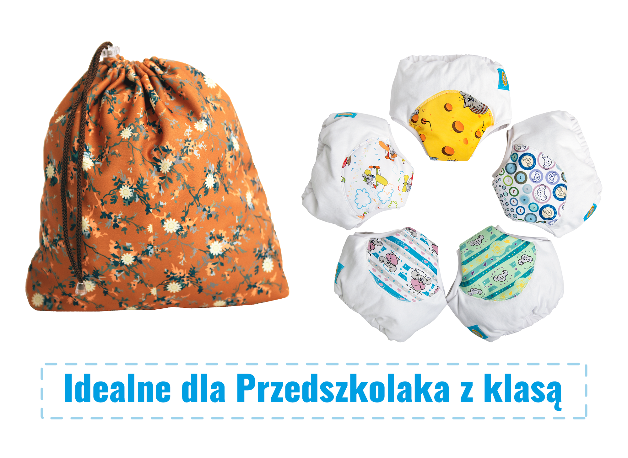 DUŻY – Pakiet treningowy idealny do przedszkola” składa się z 5 par specjalnych majteczek treningowych, które zostały zaprojektowanie z myślą o potrzebach dzieci w wieku przedszkolnym. Z kolei nieprzemakalny worek dołączony do zestawu to uniwersalny transporter nie tylko na majteczki, ale i inne dziecięce skarby. Pakiet powstał z myślą o maluchach, które dopiero zaczynają naukę korzystania z nocnika i codziennie, krok po kroku, zmierzają ku upragnionej samodzielności. To także pierwsza poważna bielizna dla dziecka, zapewniająca mu odpowiedni komfort fizjologiczny i psychiczny.