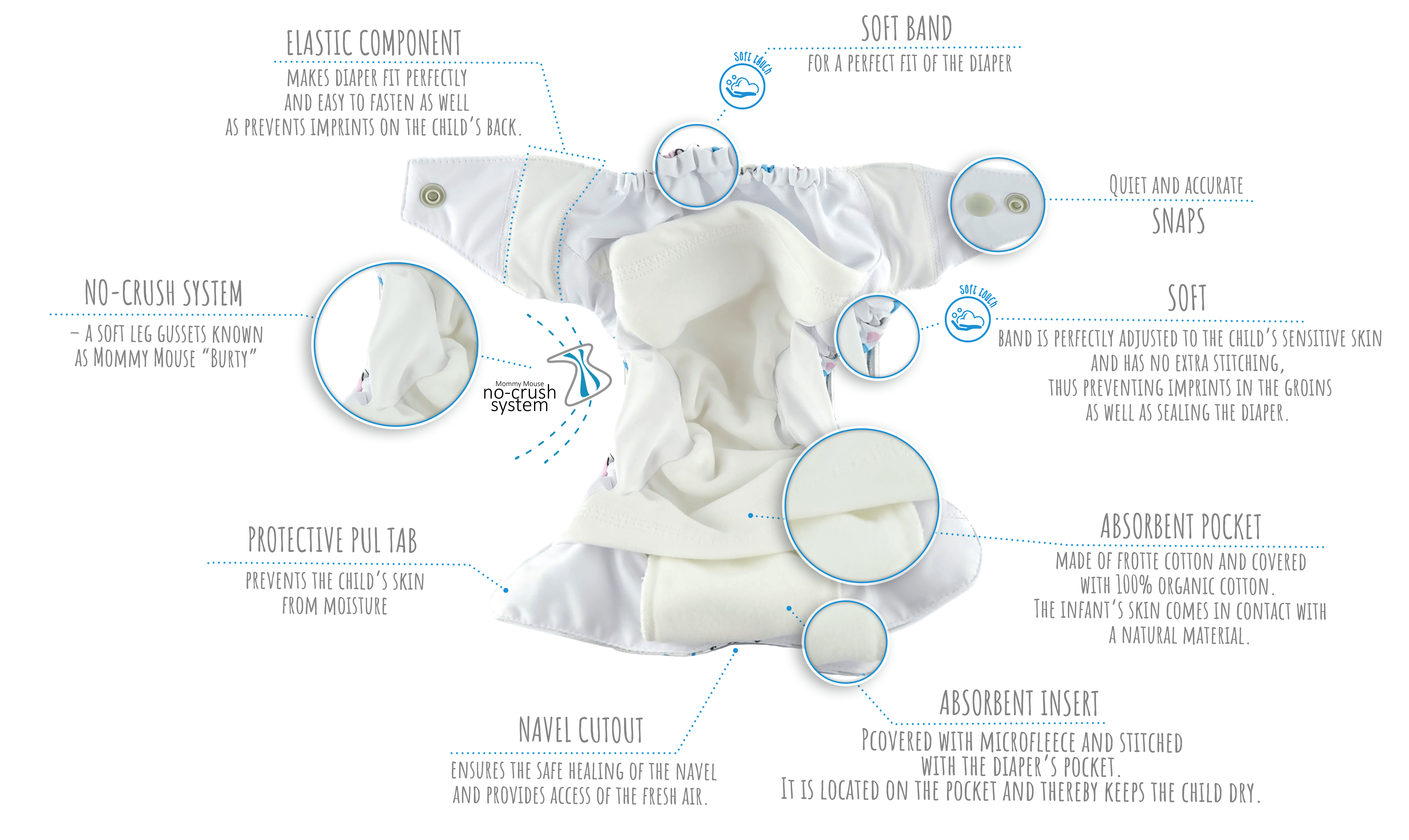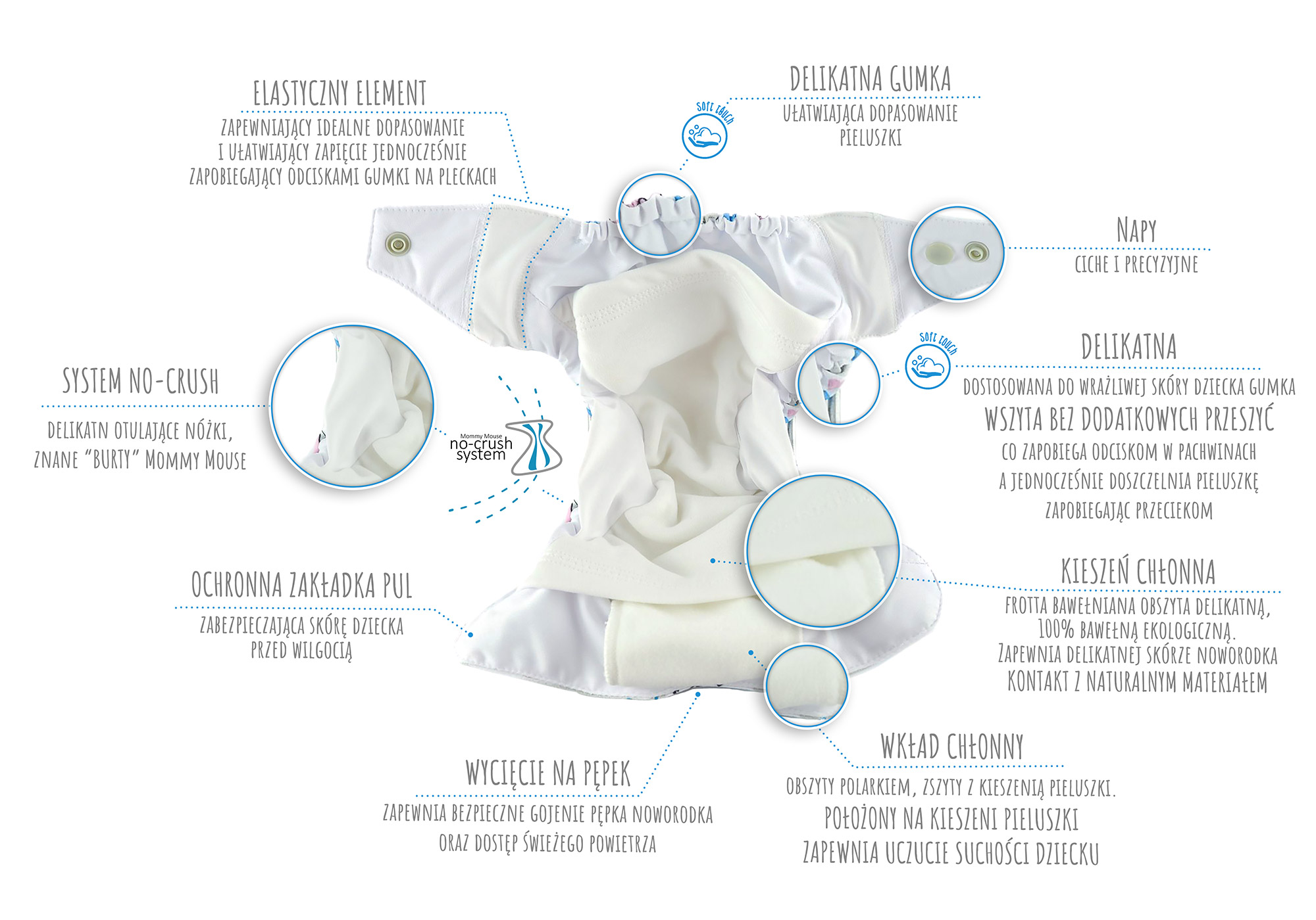 SYSTEM NO-CRUSH –delikatnie otulający nóżki dziecka-znane „burty” Mommy Mouse – zabezpiecza i  uszczelnia oraz  zatrzymuje mleczne kupki niemowląt – nie pozwalając wydostać się zawartości pieluszki  na ubranko.
