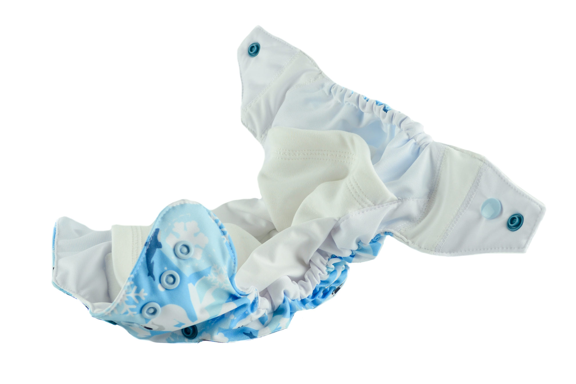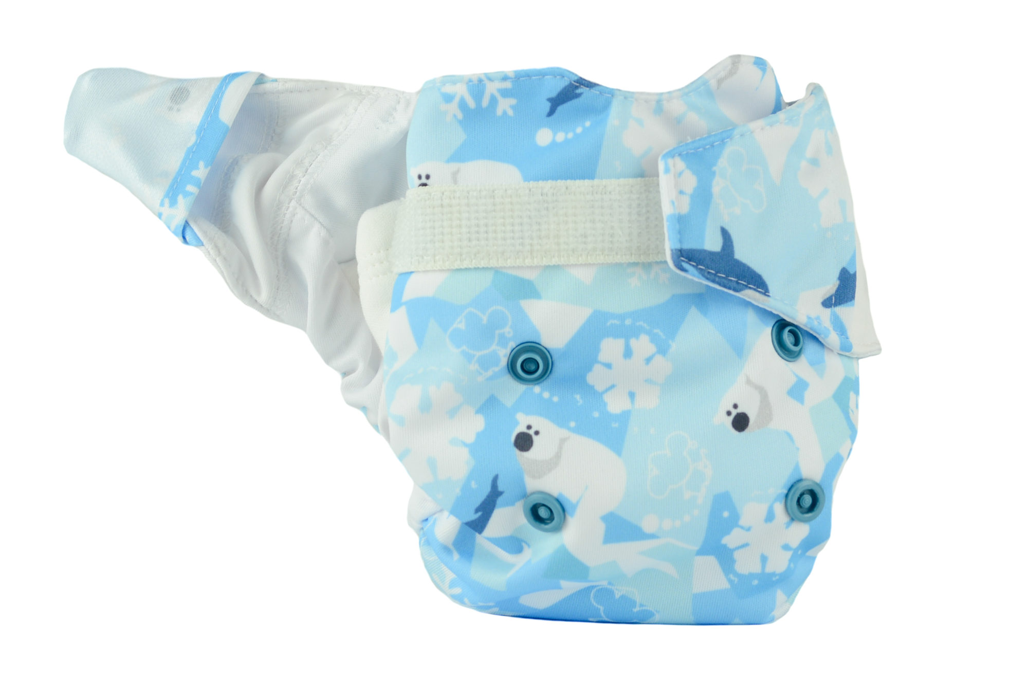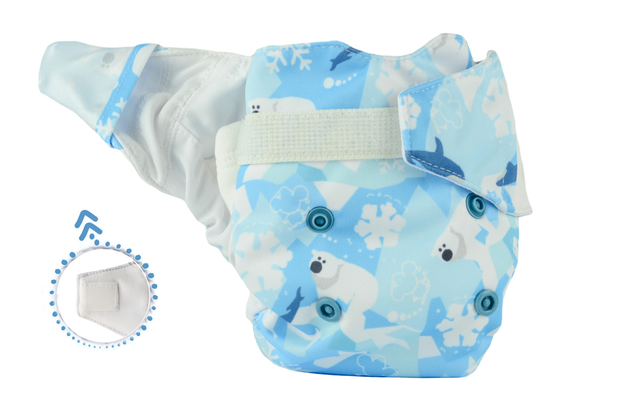 Delikatna gumka na pleckach oraz elastyczny element zszyty z łapką zapinającą-umożliwiają precyzyjne dopasowanie pieluszki jednocześnie nie powodując odcisków na skórze dziecka.