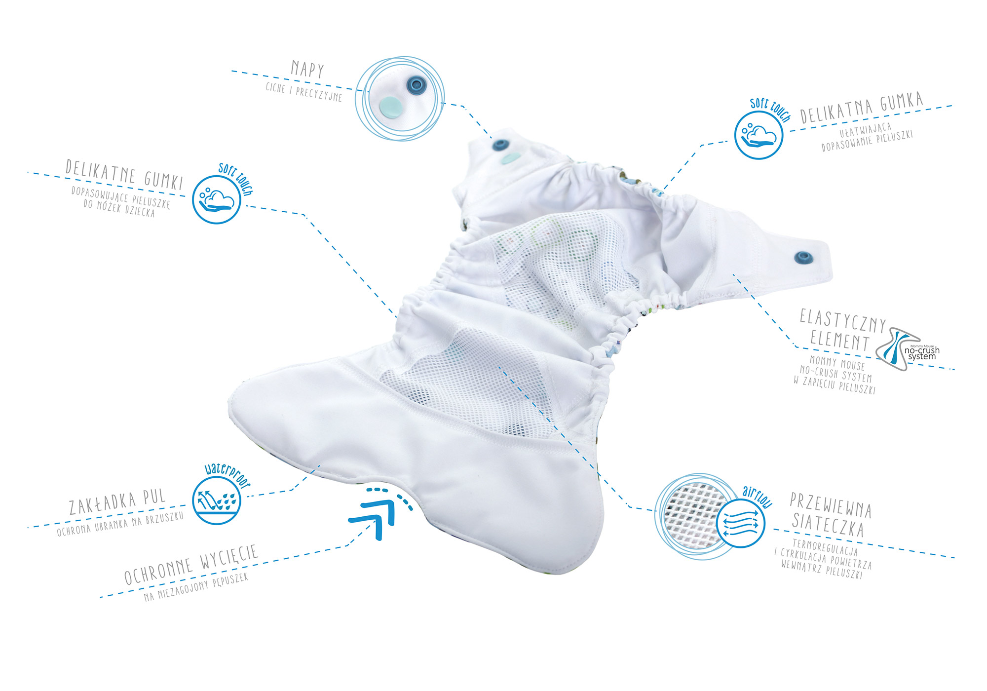 W zapięciu pieluszki znajduje się wbudowany elastyczny element Mommy Mouse NO-CRUSH SYSTEM, dzięki któremu pielucha nie zostawia odciśniętych śladów gumki na pleckach.