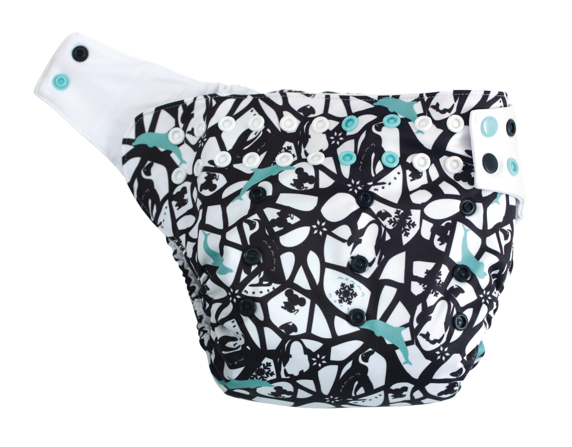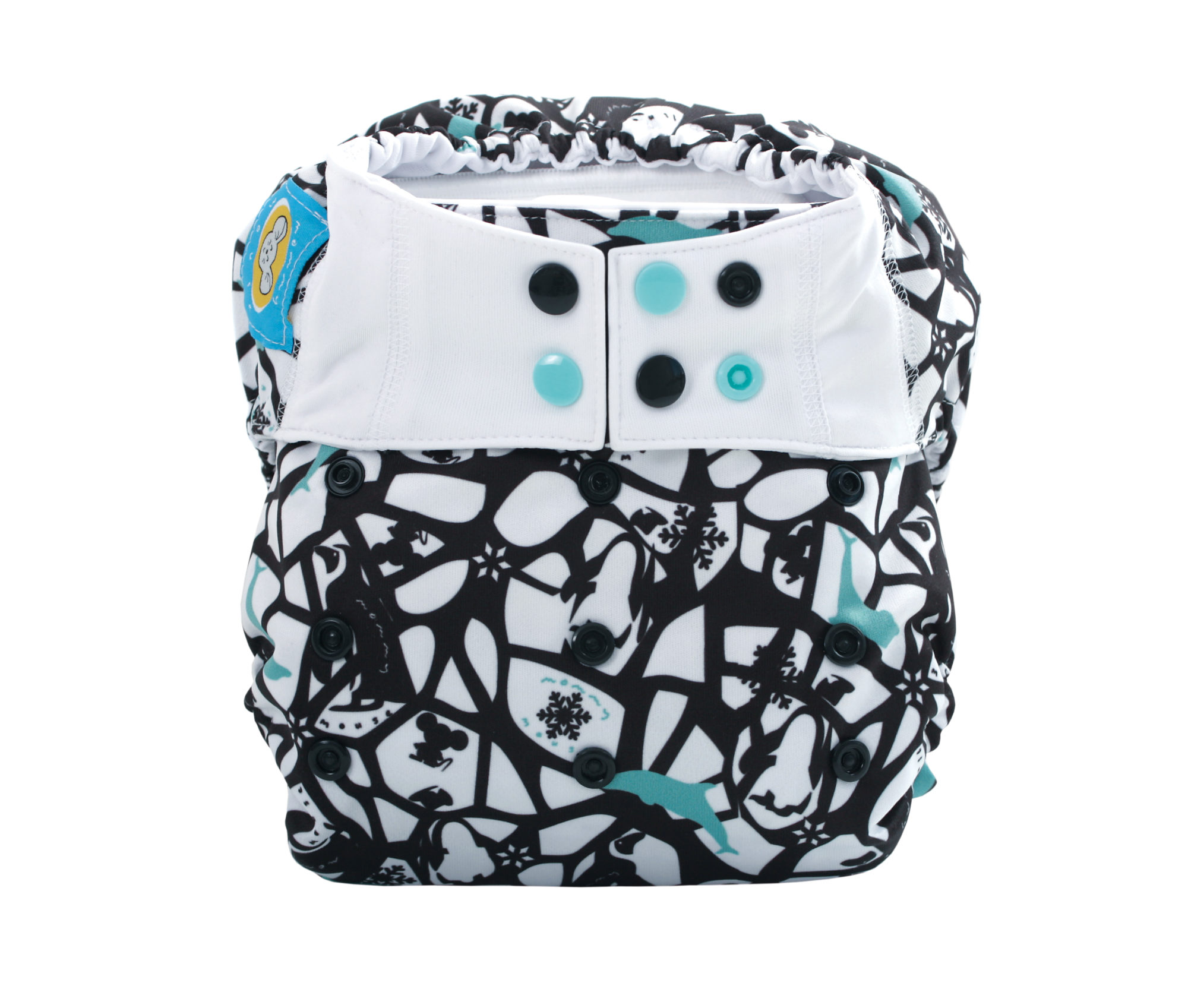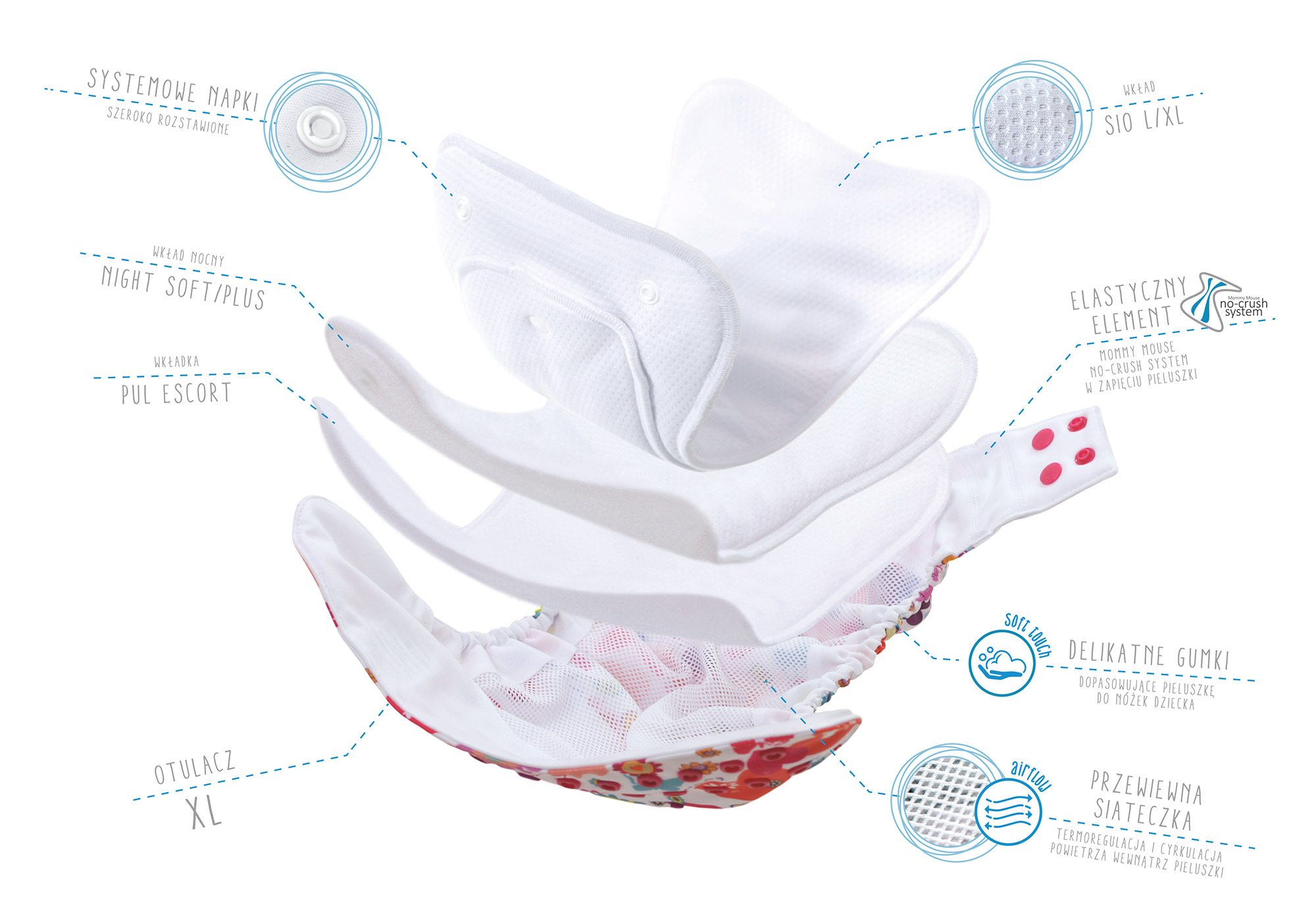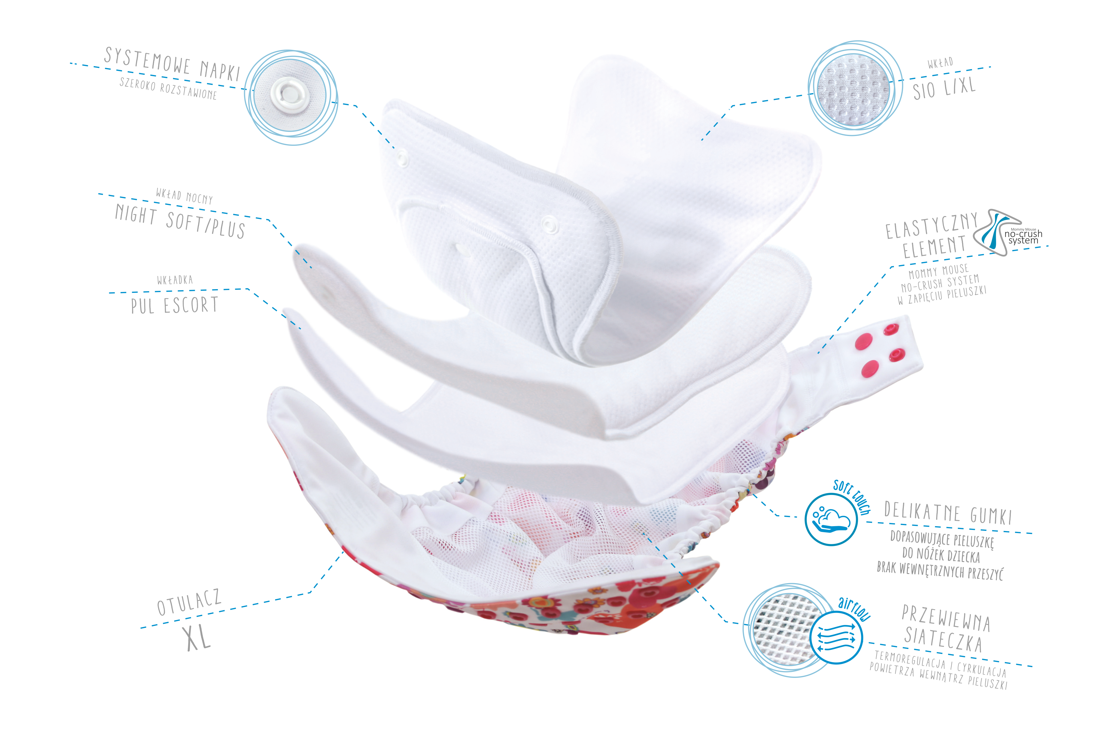 Otulacz XL podobnie jak otulacz One Size ma wewnątrz siateczkę i w zapięciu łapki Mommy Mouse no-crush system, dzięki któremu pieluszka nie zastawia odciśniętych śladów gumki na pleckach.