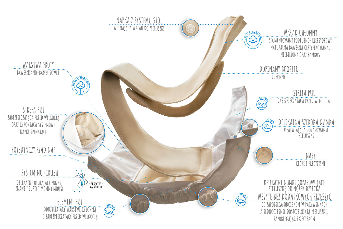 System NO-CRUSH – delikatnie otulający nóżki dziecka-znane „burty” Mommy Mouse – zabezpiecza i uszczelnia oraz zatrzymuje zawartośc pieluszki wewnątrz – nie pozwalając wydostać się na ubranko.