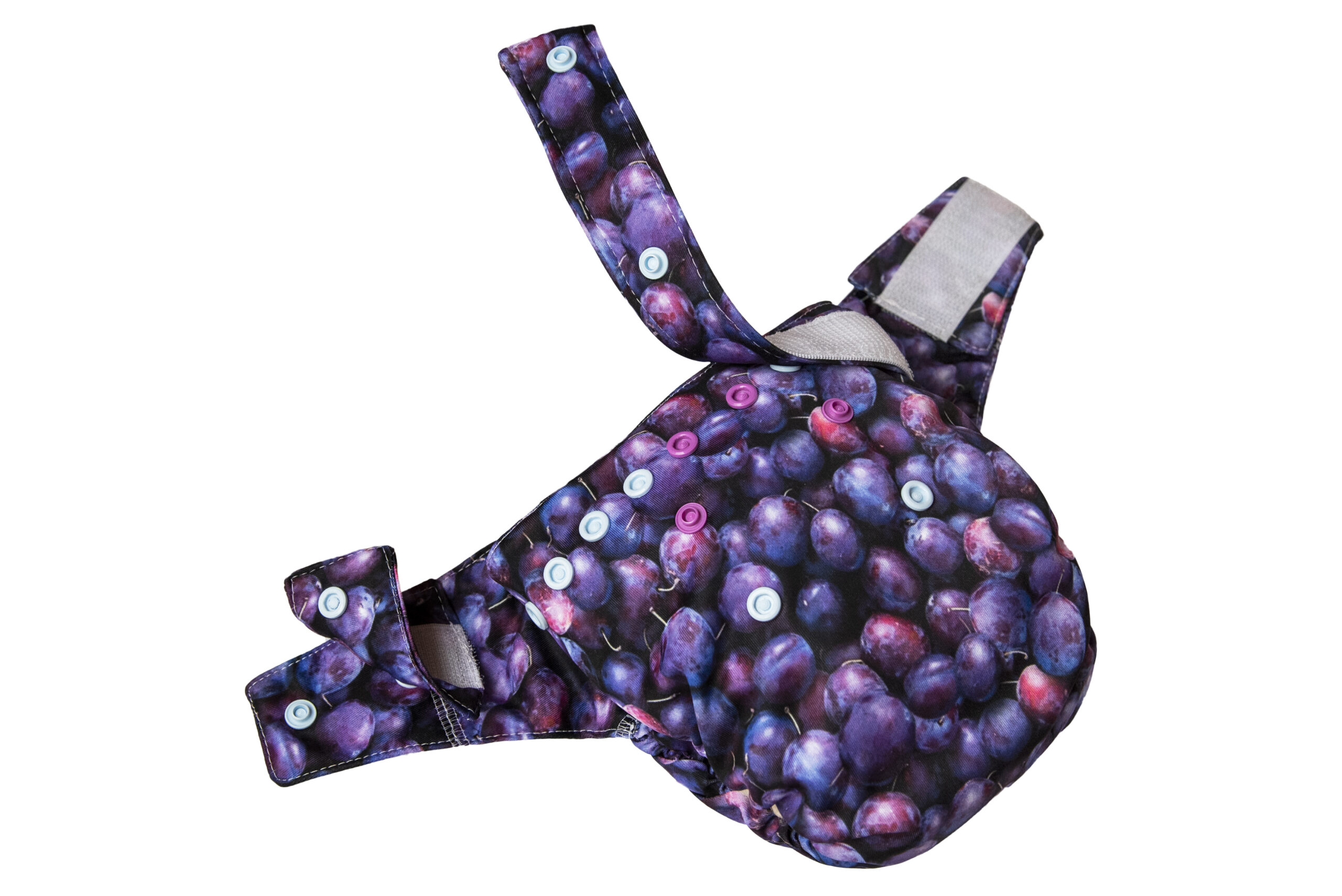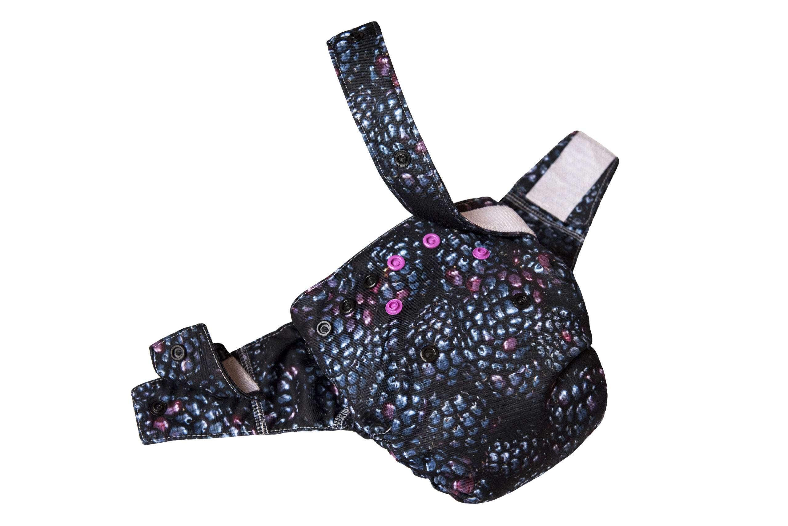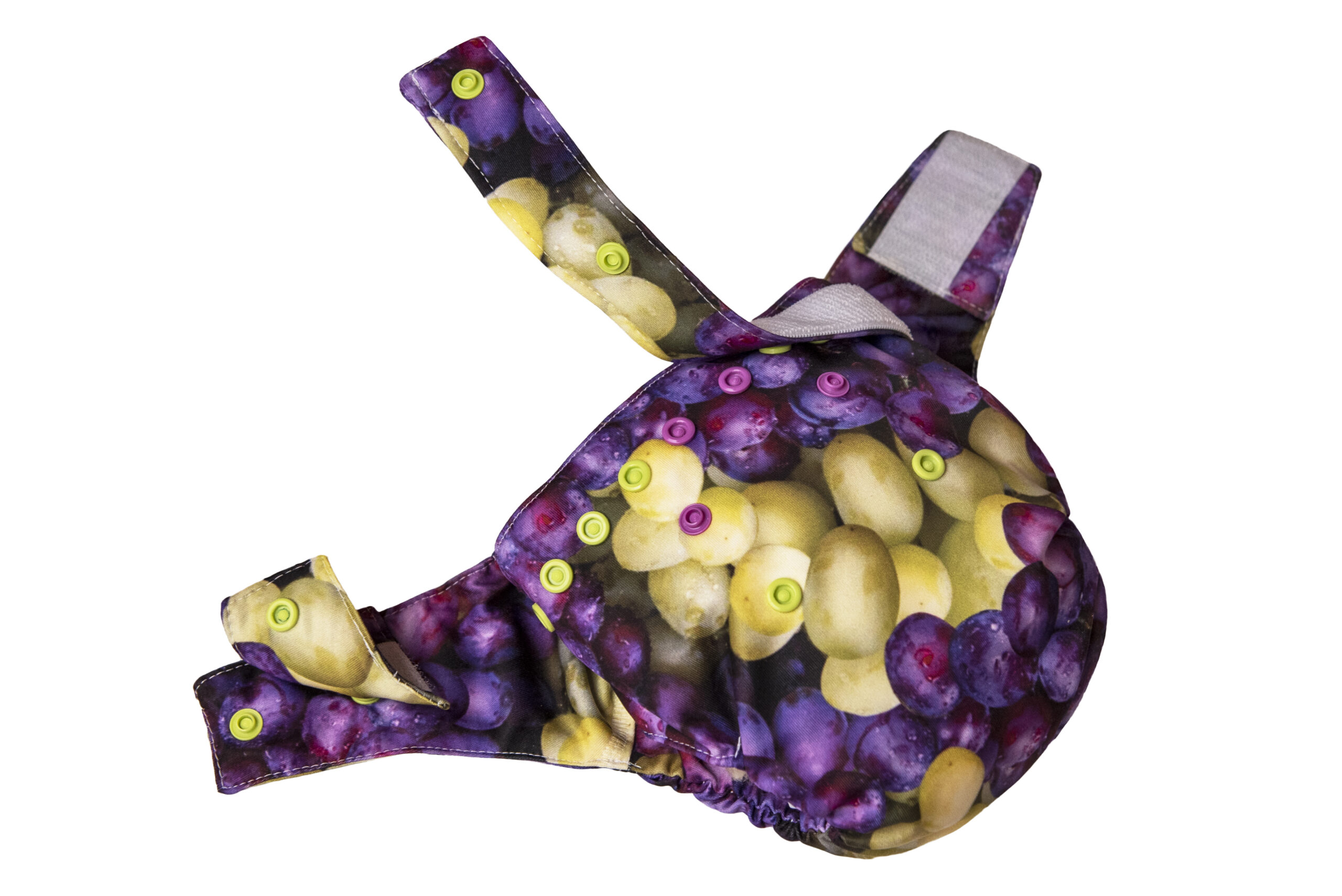 Część zewnętrzną stanowi wodoodporny PUL wyposażony w poziomy, pojedynczy rząd nap spinajacych oraz pionowy system nap do dokładniejszego dopasowania rozmiaru pieluszki.