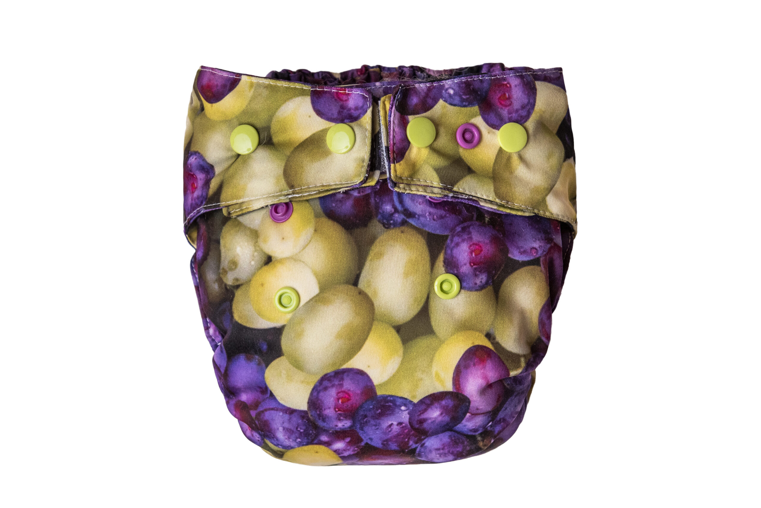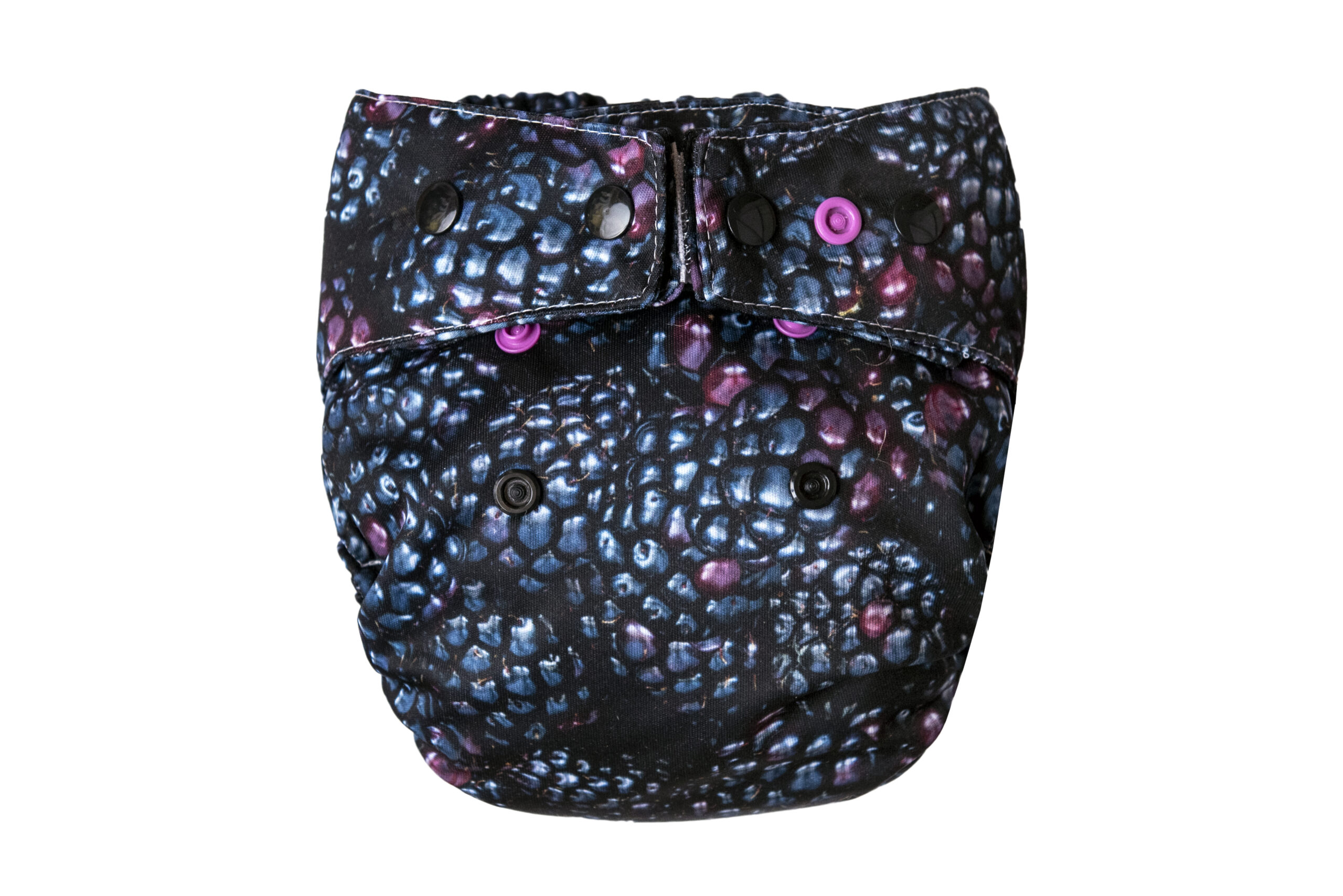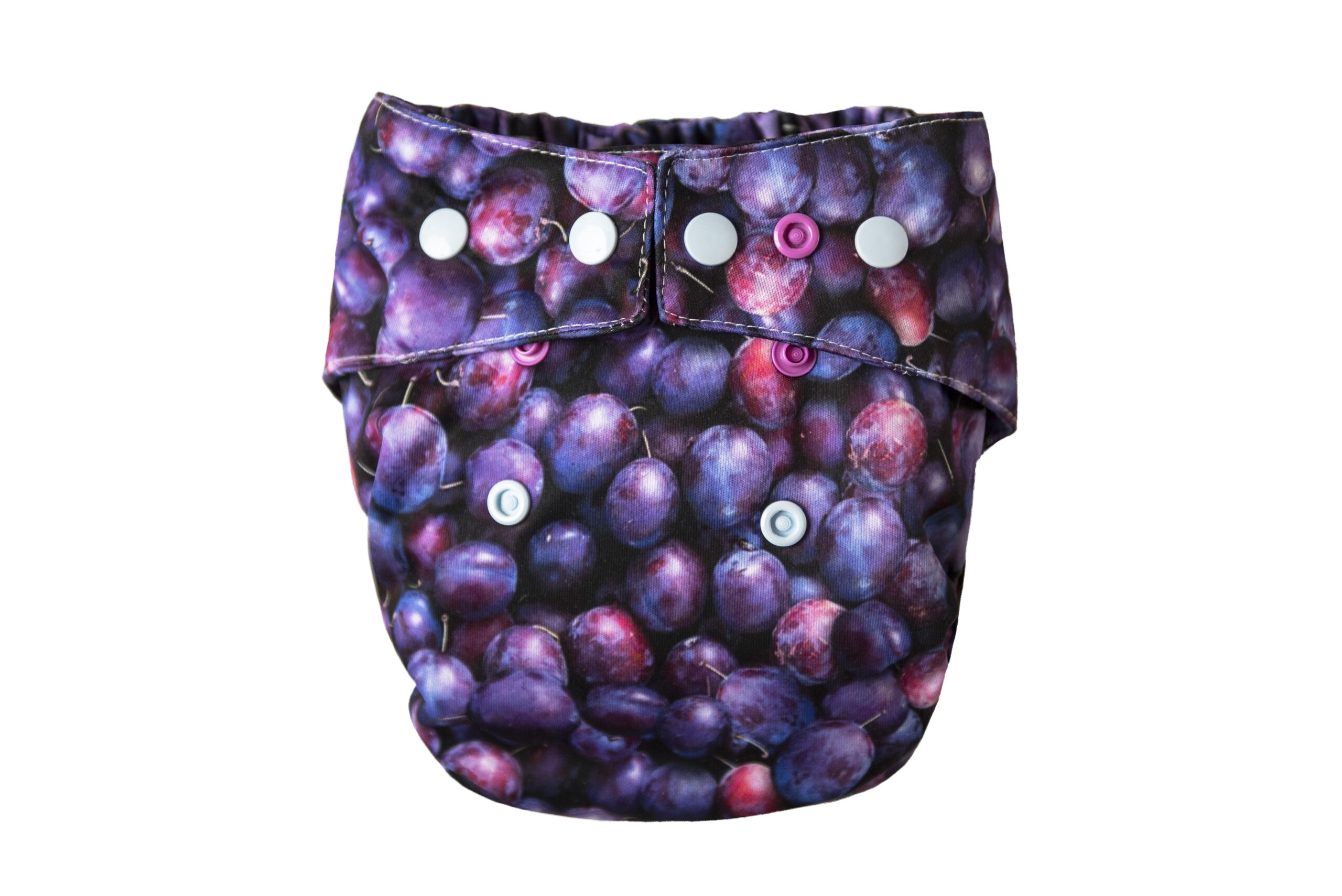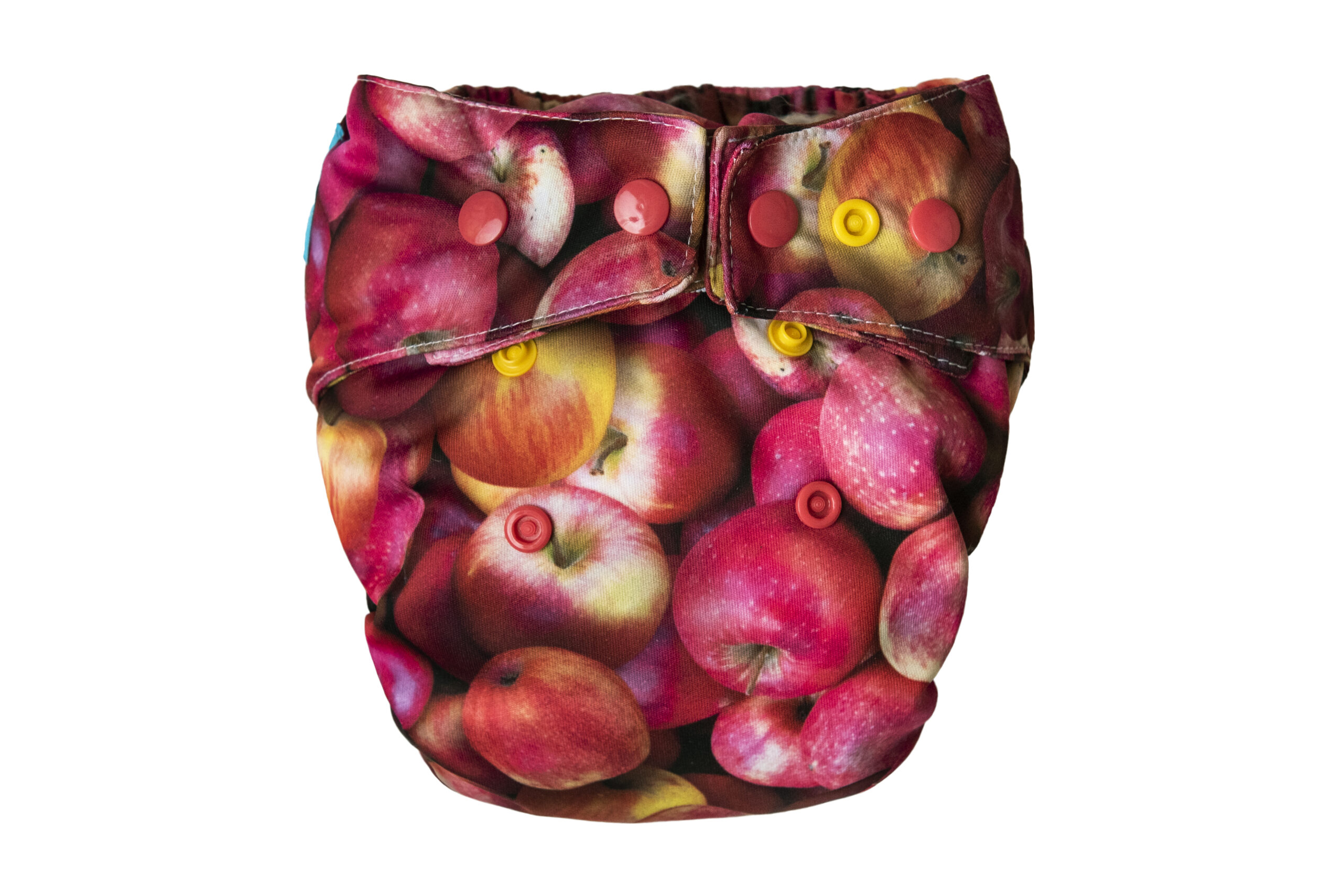 Część zewnętrzną stanowi wodoodporny PUL wyposażony w poziomy, pojedynczy rząd nap spinajacych oraz pionowy system nap do dokładniejszego dopasowania rozmiaru pieluszki.