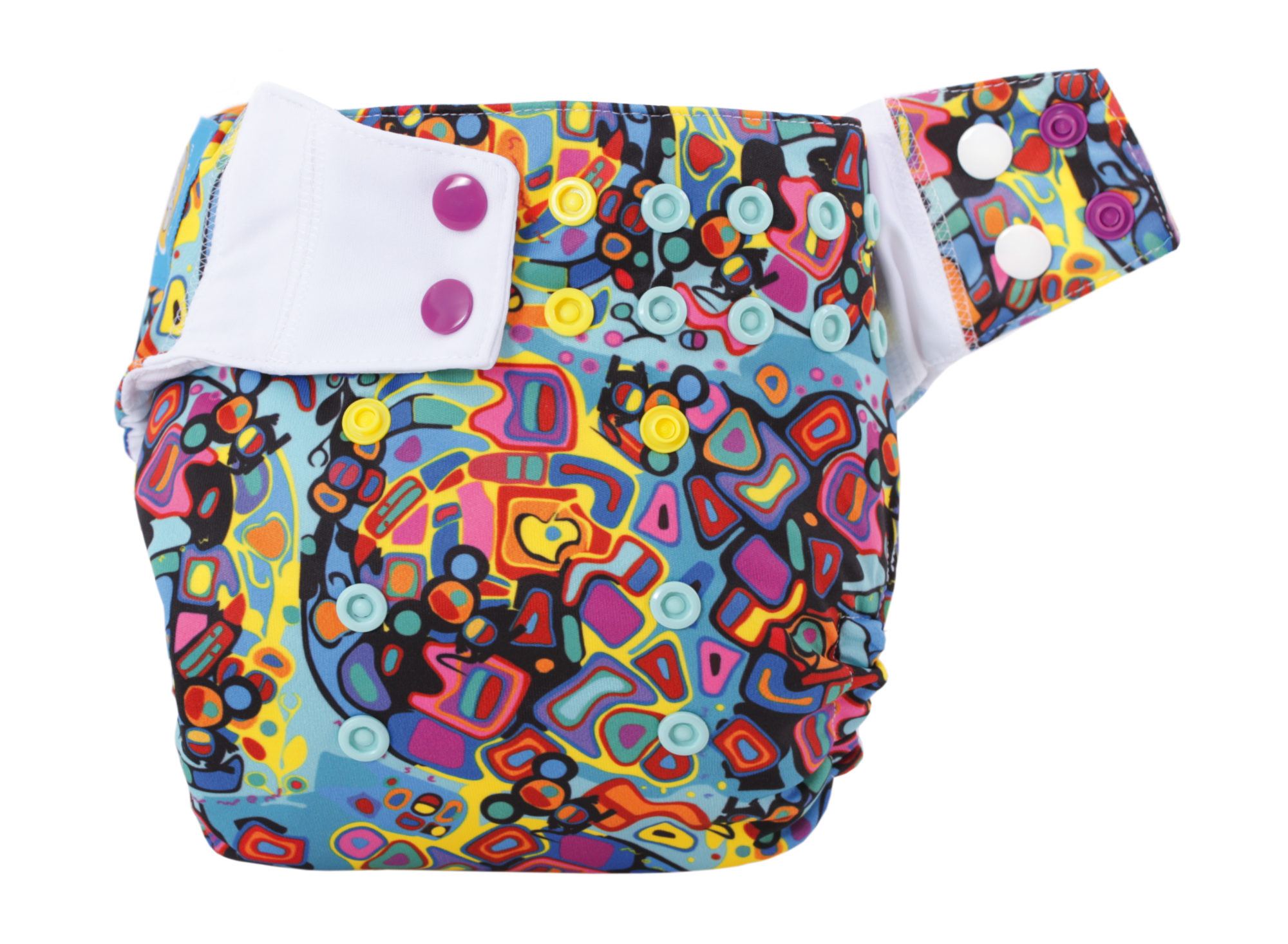 Pieluszka składa się z otulacza z systemowymi napkami, do których przypina się różne rodzaje wkładów.