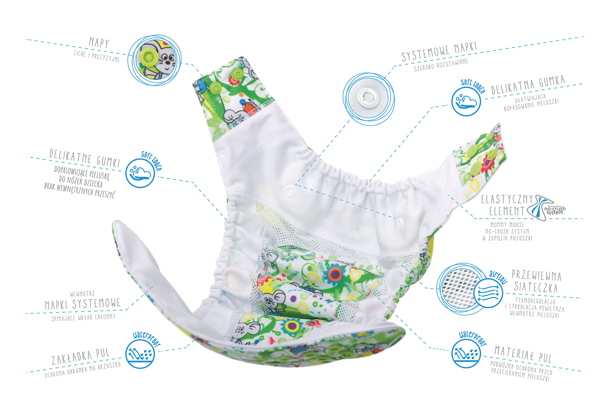 Sama pieluszka – otulacz została bardzo dokładnie zaprojektowana do zmieniających się potrzeb dziecka. Ma kilka elementów elastycznych, które pomagają w dopasowaniu pieluszki do zmieniającej się budowy dziecka. PUL został oddzielony od skóry dziecka kombinacją materiałów, które mają za zadanie utrzymać w pieluszce optymalną temperaturę i zapewnić doskonałą cyrkulację powietrza. Aby osiągnąć najlepsze warunki oddychalności pieluszki, do produkcji użyliśmy „ekspertów” w termoregulacji czyli materiałów, które wykorzystywane są w sportach ekstremalnych jednocześnie posiadające certyfikaty dla niemowląt tj. OEKO TEX Standard 100 i Bluesign CERTIFICATE.