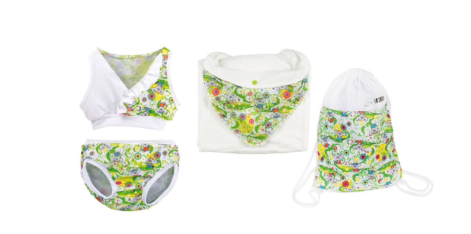 Doskonały na wakacyjny prezent i nieodzowny w letnim wyposażeniu dziecka – zestaw plażowo-kąpielowy.
